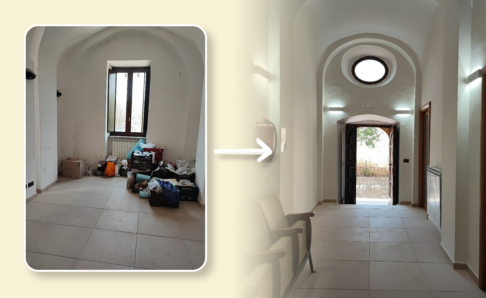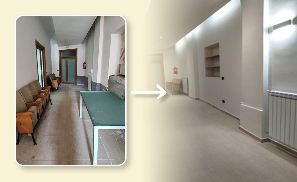 Il progetto ha previsto la rifunzionalizzazione degli ambienti senza interventi strutturali, attraverso la rimozione di arredi e materiali non recuperabili e il ripristino degli impianti elettrici, dell’illuminazione e dei servizi igienici, oltre all’integrazione dei corpi scaldanti mancanti.